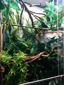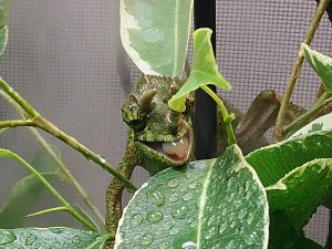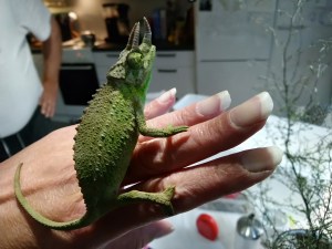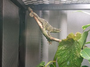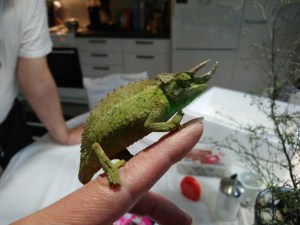No nyt se tapahtui! 4.10 hain länsikeskuksen Faunattaresta Jacksonin kameleontin kotiin. Kyseessä olikin odotettua pienempi kaveri. Valmiina ollut terraario on aivan liian suuri ja laitoin Elviksen keittiössä sijaitsevaan terraarioon, joka alunperin oli valmisteltu tulevaisuudessa tulevaa naarasta varten. Siihen tein valmisteluja. Kyseessä siis metallikehyksinen Ikean hyllykkö. Hyttysverkosta tein seinät ja kattona metalliritilä, jossa myös hyttysverkkoa. Uvb-lamppu, lämpölamppu ja päivänvalo ovat katolla. Lämpölampuksi riittää tavallinen hehkulamppu, koska yli 30 asteen lämpö on vaarallinen Jacksonin kameleontille. Tämä laji kaipaa viileää mutta kosteaa ilmastoa, kuten aiemmin varmaan jo olen maininnut. Bauhauksesta hain ilmankostuttimen, josta saa helposti kosteutta sitä vaativalle. Kostutinta muokkaamalla laitoin sen käyttöön.