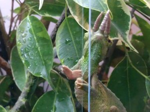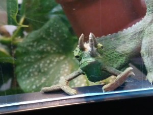 Avain kiertyy lukossa avaten oven. Astun eteiseen huokaisten. Kotona taas. Eteisessä vastassa 2 terraariota. Tertun ja Elvin. Terttu on Jemenin kameleontti naaras. Iältään 5 vee. Elvi on Jacksonin kameleontti naaras, noin pari vuotias. Vehreän rehevät terraariot asukkeineen saavat minut ylpeyden ja ilon valtaan. Huomaan päivittäin jähmettyväni tuijottamaan niitä hymy huulilla. Juttelen niille päivän kuulumiset ja kyselen miten päivä on sujunut. Useimmiten vastaus on kiukkuista sähinää. Elekieli kertoo, että askel lähemmäs vielä niin… Etenkin Terttu. Siinä tiukka mimmi, jonka reviirille ei muut tule. Elvi on säyseämpi ja yrittää matkia oksan muotoja piiloutuessaan oksan taakse.