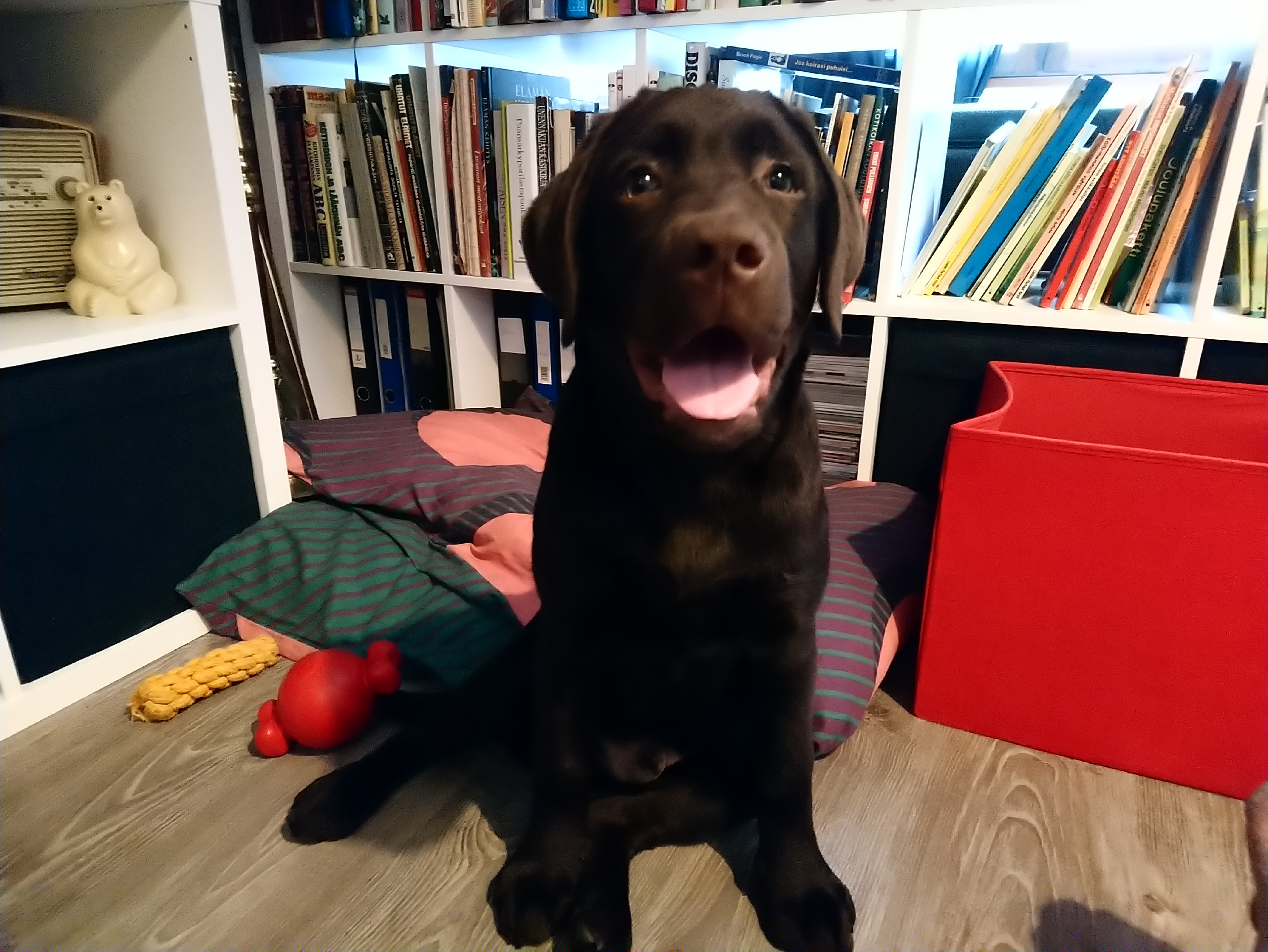On tullut mieleen, kuinka paljon rauhattomuus voi johtua kivuista? Koska sitä Hannu on. Rauhaton ja ylivilkas. Yötä päivää. Valehtelematta alati on jotain meneillään. Lukuun ottamatta ulkoiluja, treenaamista, yhteistä leikkimistä tai hellimistä on Hannu tekemässä kiellettyjä kuten repimässä tyynyjä sohvalta, jyrsimässä kenkiä, mattoja, seiniä tai lattialistoja. Tuntuu, ettei mikään väsytä Hannua. Jokaiseen päivään sisältyy useita ulkoiluja eri mittaisina, ulkona tai sisällä koulutusta, aktivointilelujen kanssa touhuamista ja useita kertoja viikossa koirakamujen kanssa leikkiä.